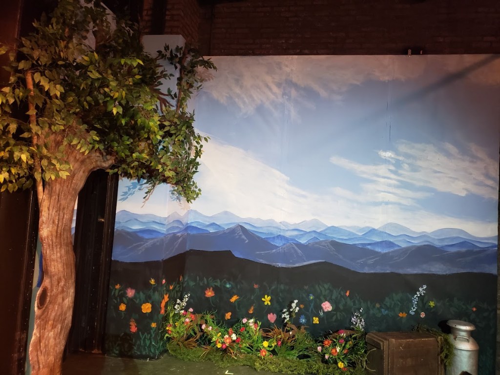 Town Theatre, 2022. Scenic design by Danny Harrington. Mountain vista panels and trees painted by Corey Langley. Assisted by Ian Neff.